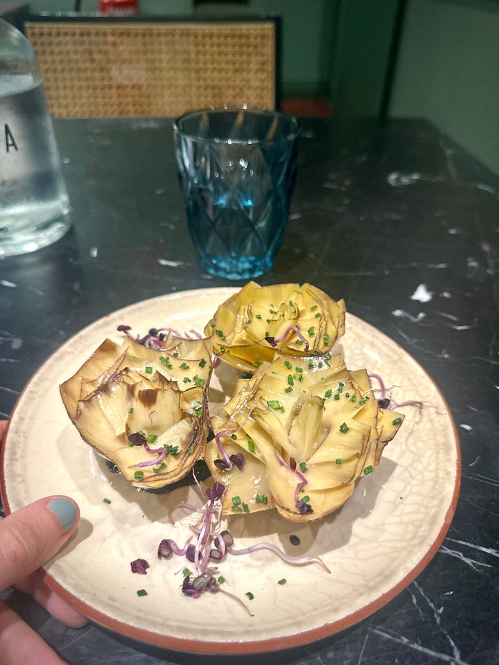 I also very, very much recommend the vegan tapas at Velada, a really pretty restaurant located just by the Barcelona Cathedral. I had peppers filled with vegan cheese, grilled artichoke with black garlic aoili, and tacos with guacamole and black beans. A total treat.